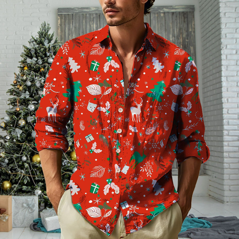 2025跨境新款圣诞节日风男士衬衣 圣诞聚会休闲3D印花长袖衬衫