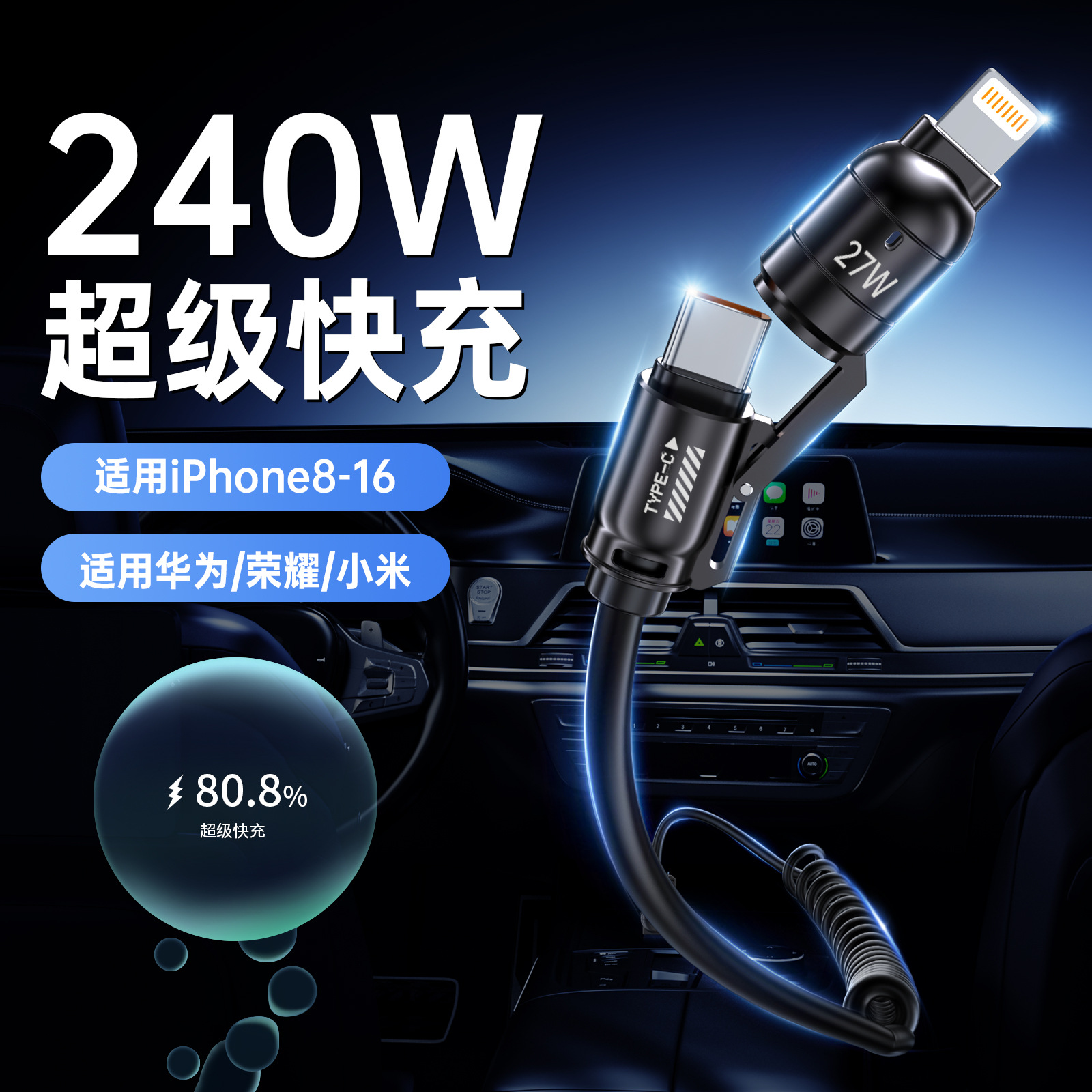车载充电线240W弹簧四合一数据线typec超级快充适用于华为苹果16