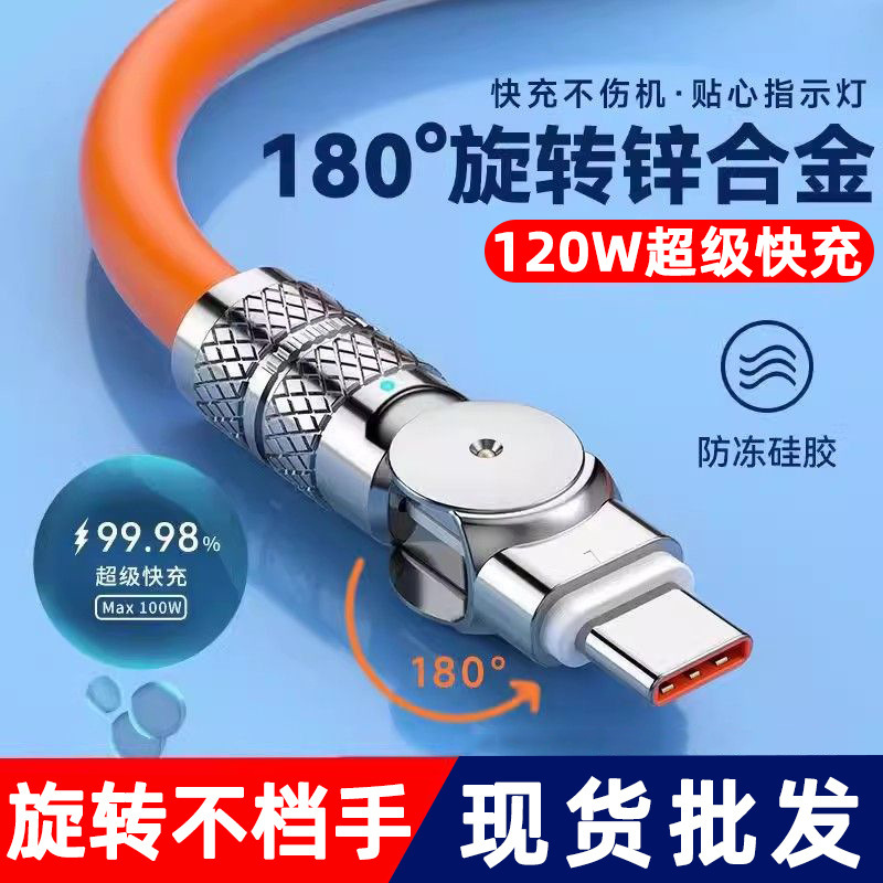 180°旋转弯头带LED灯机客线120W锌合金液态硅胶快充电线厂家批发