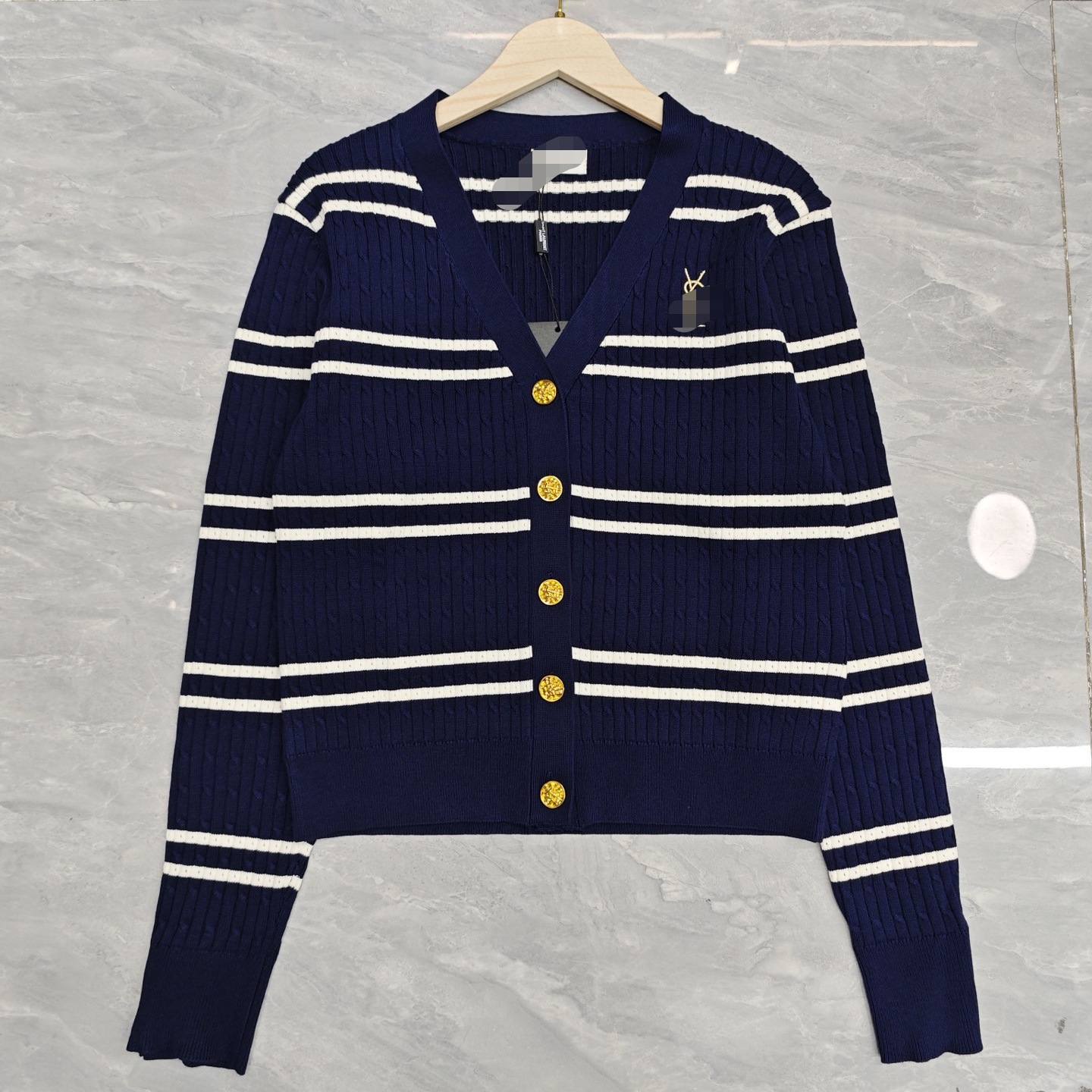 深圳南油女装秋季新款经典款条纹金色刺绣纽扣V领修身针织开衫