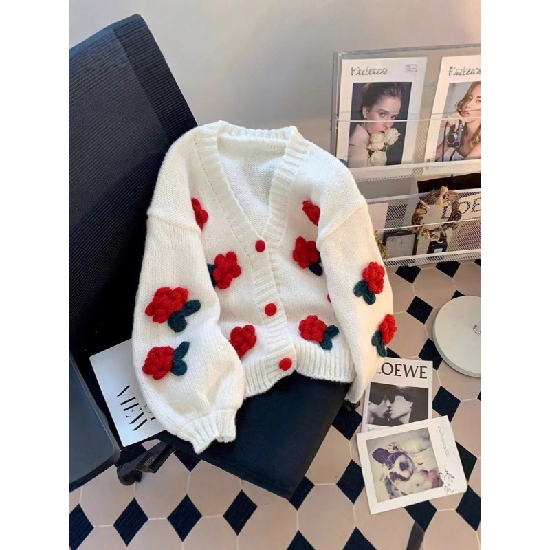 韩版秋冬新款甜美风立体花朵针织开衫女减龄百搭宽松软糯毛衣外套