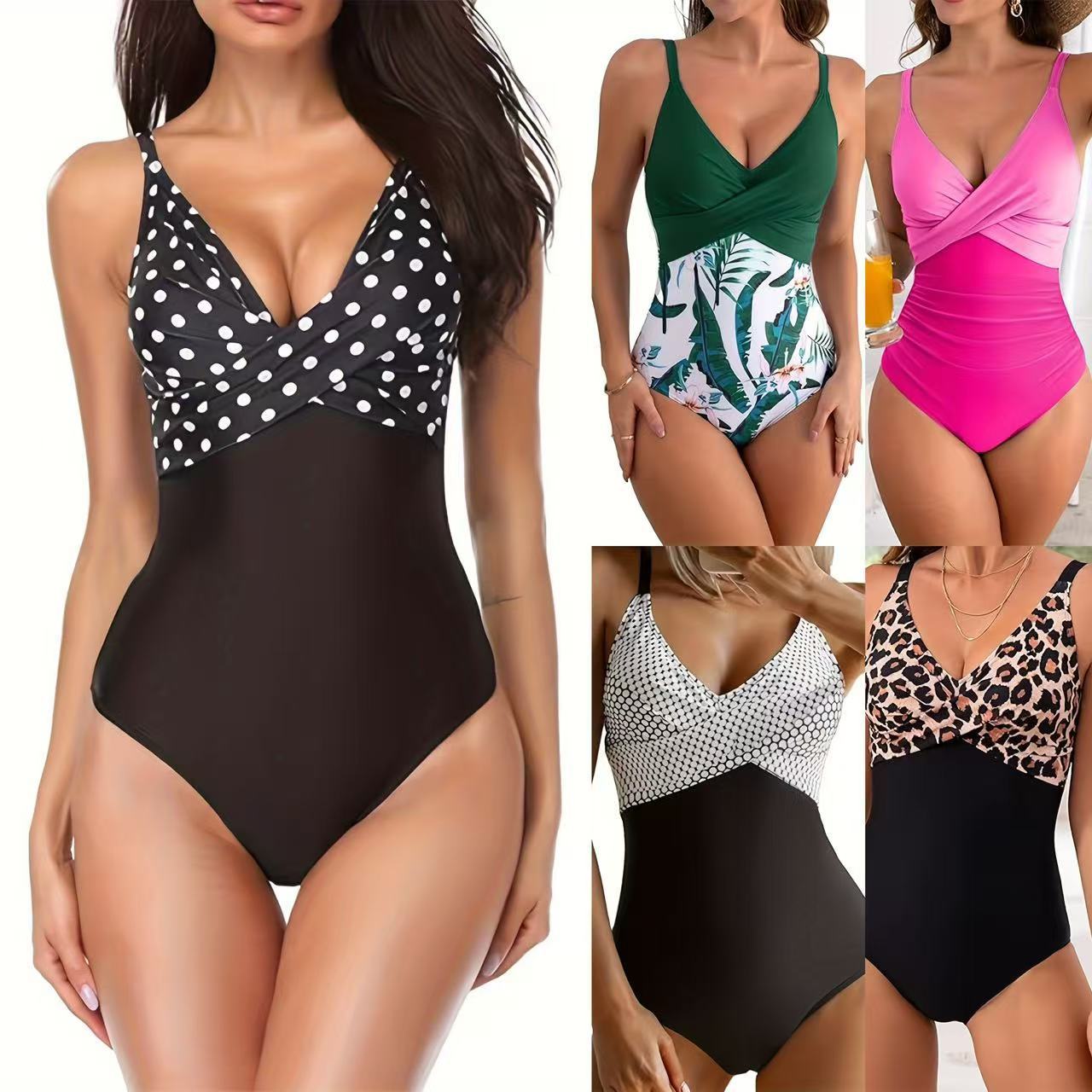 2025新款比基尼印花设计感绑带连体泳装跨境速卖通性感聚拢泳装女