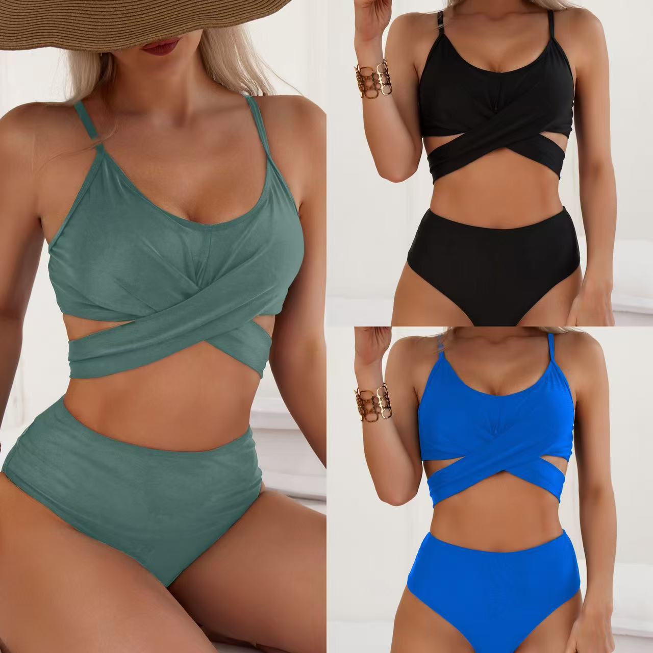 比基尼2024欧美跨境新款纯色分体泳衣女设计感绑带游泳衣bikini