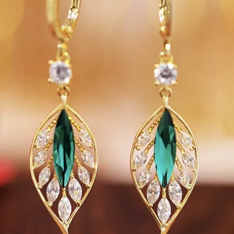 新款潮超闪锆石绿色树叶耳环耳扣女轻奢高级感气质长款耳饰2023年