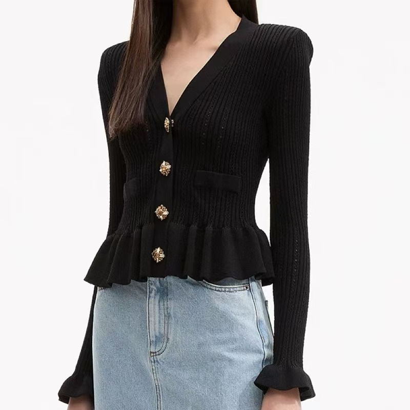 法式优雅新款V领针织衫气质长袖镂空毛衣金属扣荷叶边针织开衫