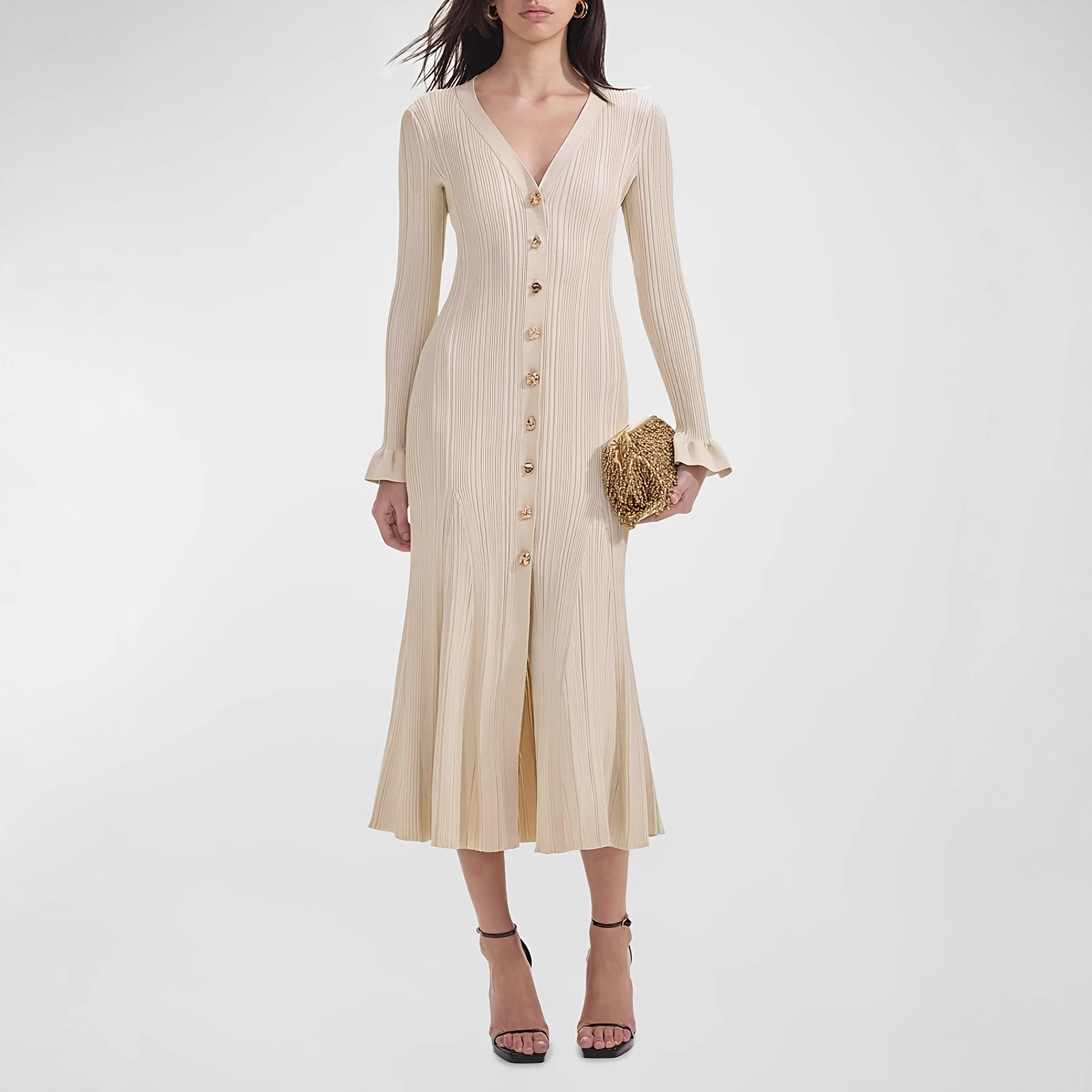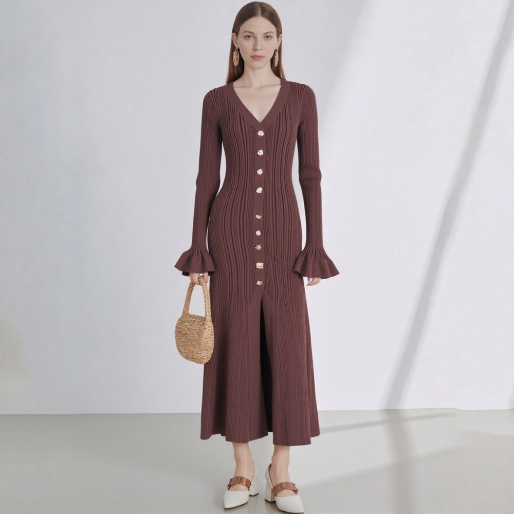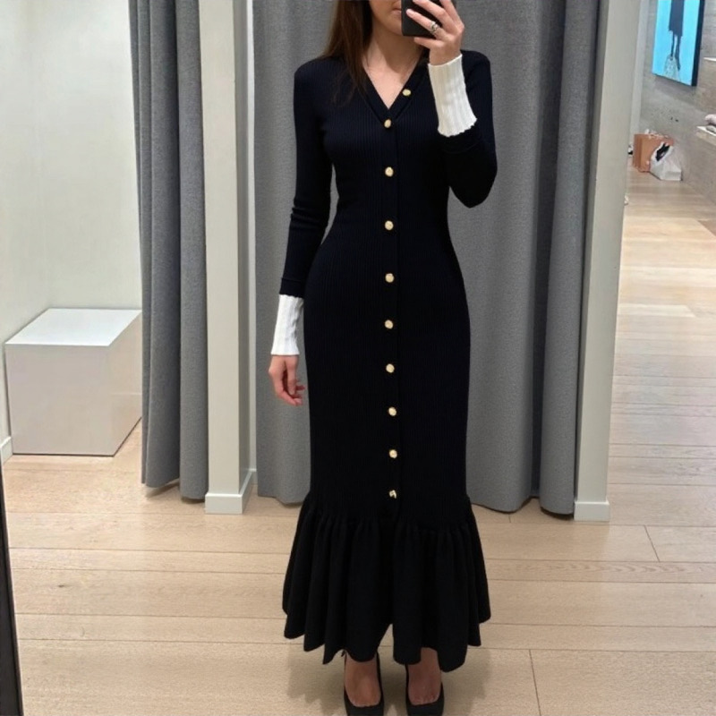 现货S家2025秋冬深圳南油新款欧美外贸针织长袖连衣裙V领鱼尾裙子