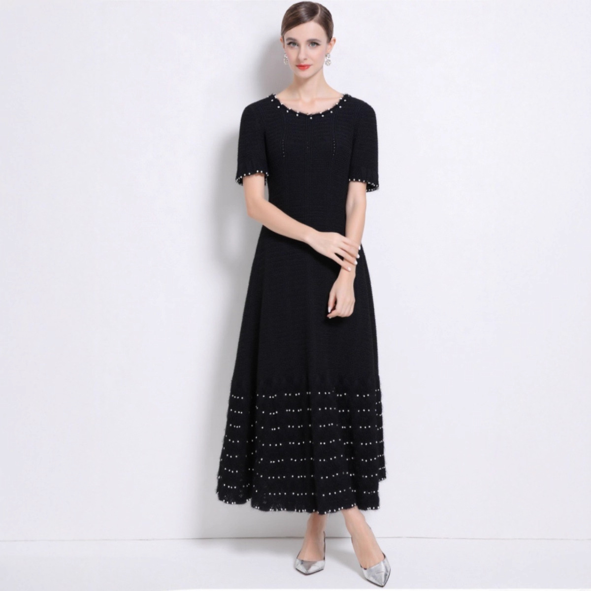 深圳南油欧美秋冬新款法式优雅长裙重工珍珠长袖百褶针织连衣裙女