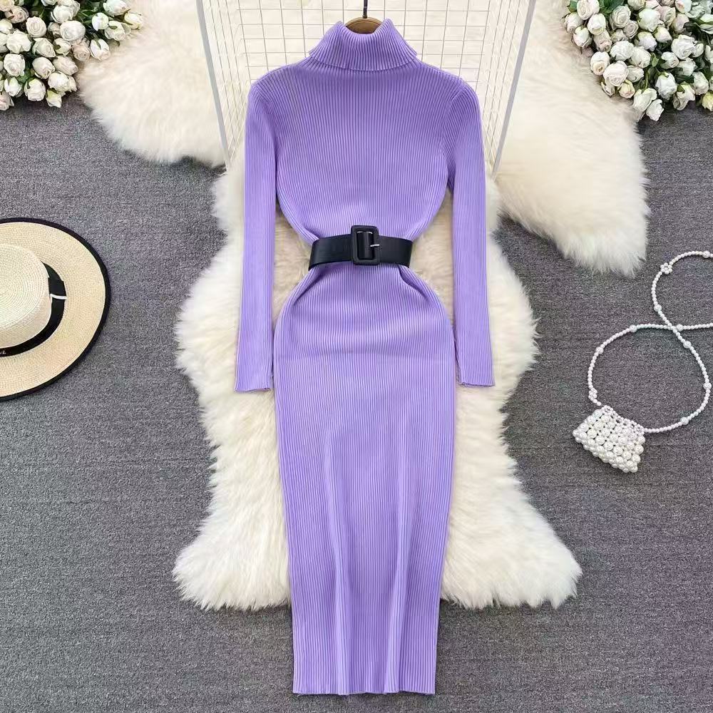 2025秋冬日气质韩版女装高领长袖显瘦修身包臀开叉针织毛衣连衣裙