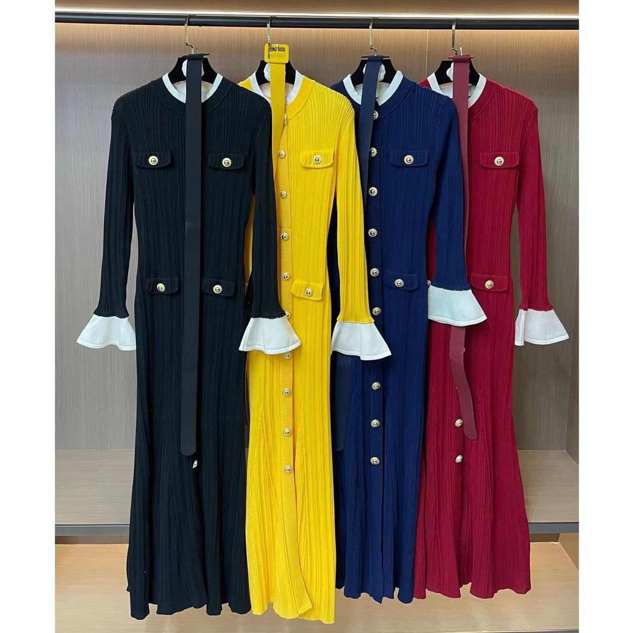 2025巴尔曼新款法式名媛修身长裙收腰高领长袖单排扣连衣裙+腰带