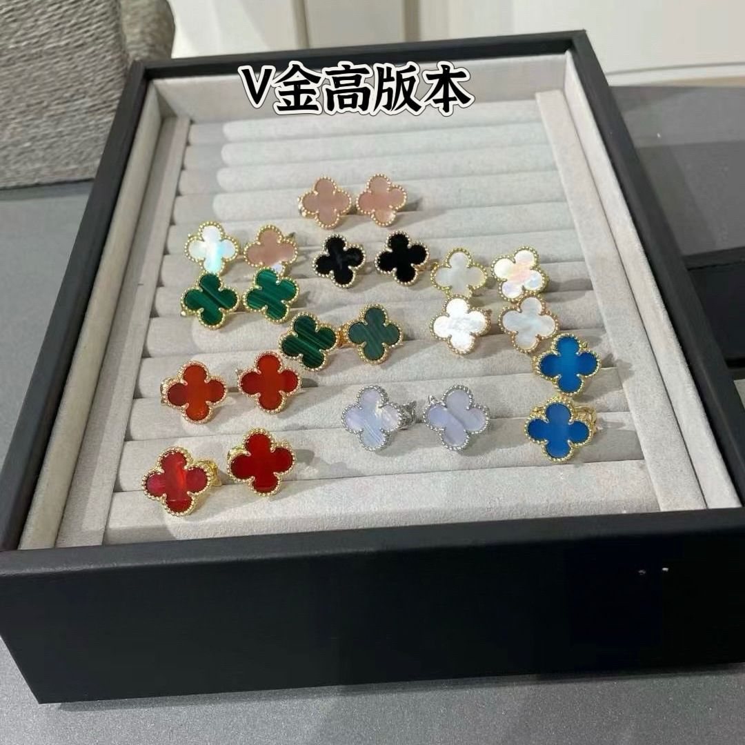 高版本四叶草迷你9MM小号耳钉女V金镀18K玫瑰金白贝母红玛瑙耳饰