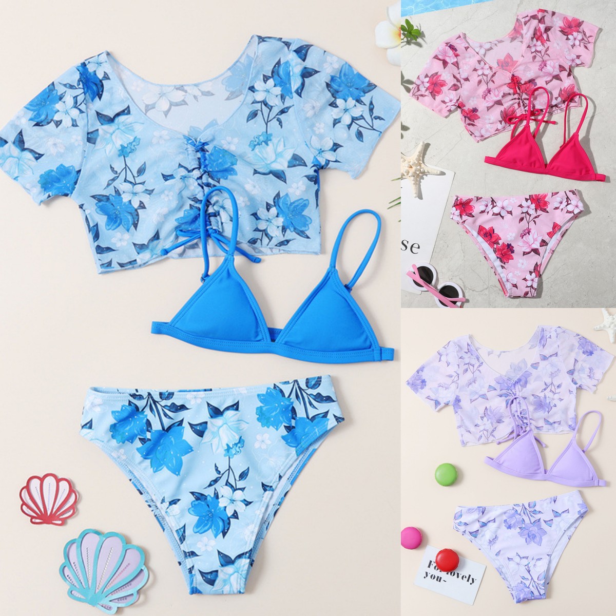 Bikini女童泳装防晒长袖罩衫儿童三件套比基尼大童外贸碎花泳衣