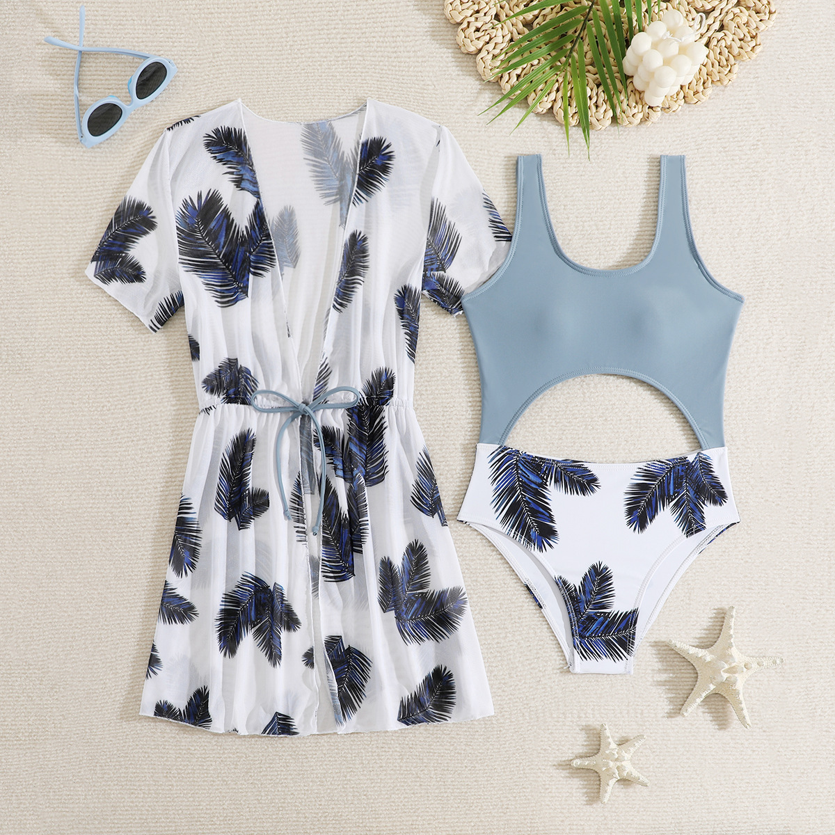 2024跨境新款两件套儿童泳衣亚马逊树叶印花女童分体中大童比基尼