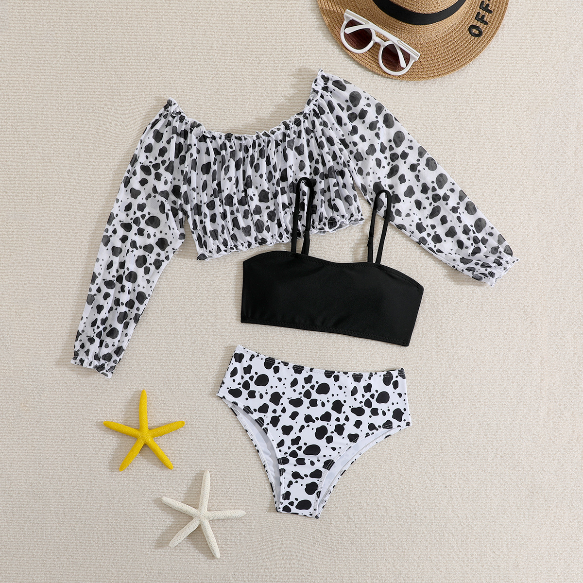 2024新款跨境欧美儿童泳衣三件套印花中大女童比基尼沙滩温泉泳装