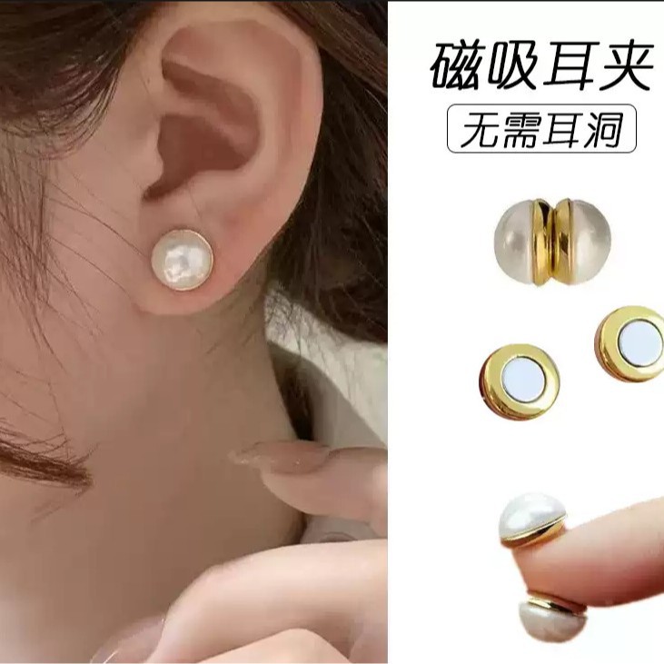 2025年新爆款磁吸无耳洞珍珠耳夹女方形吸铁石耳环个性百搭耳饰品