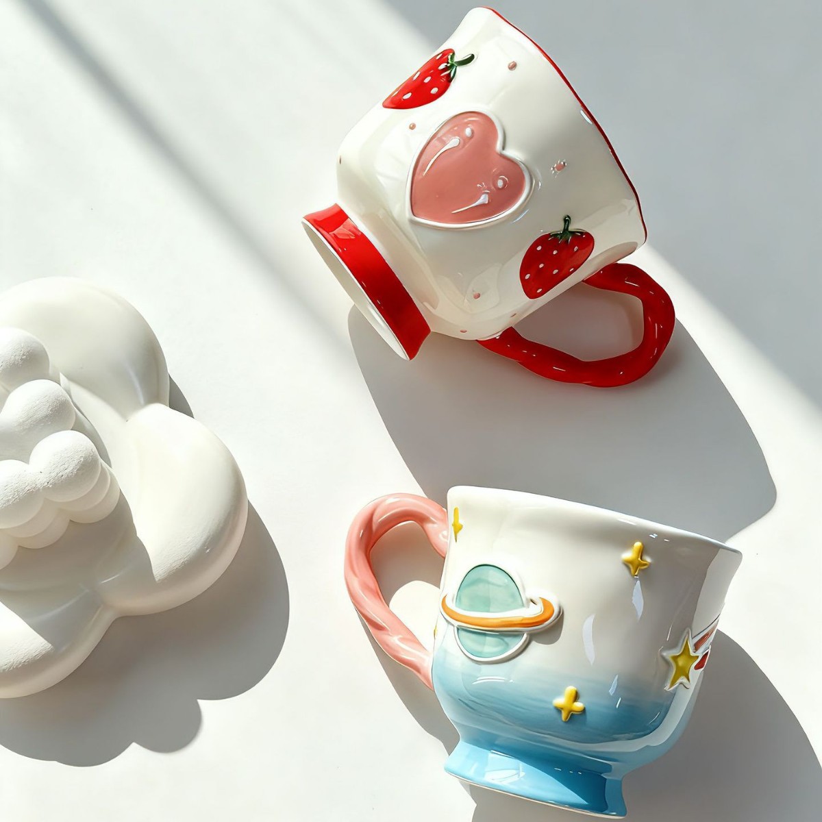陶瓷杯卡通手绘浮雕草莓爱心早餐杯 热气球星星ins风家用马克杯新