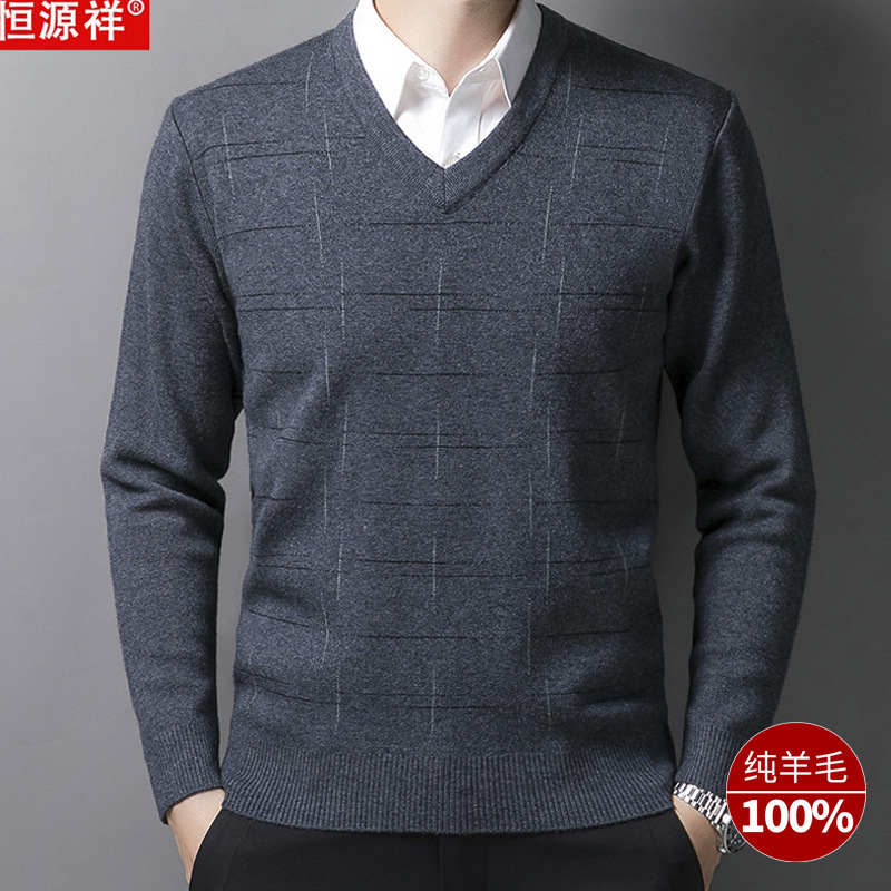 恒源祥春秋羊毛衫中年男士V领加厚鸡心领毛衣爸爸休闲保暖打底衫