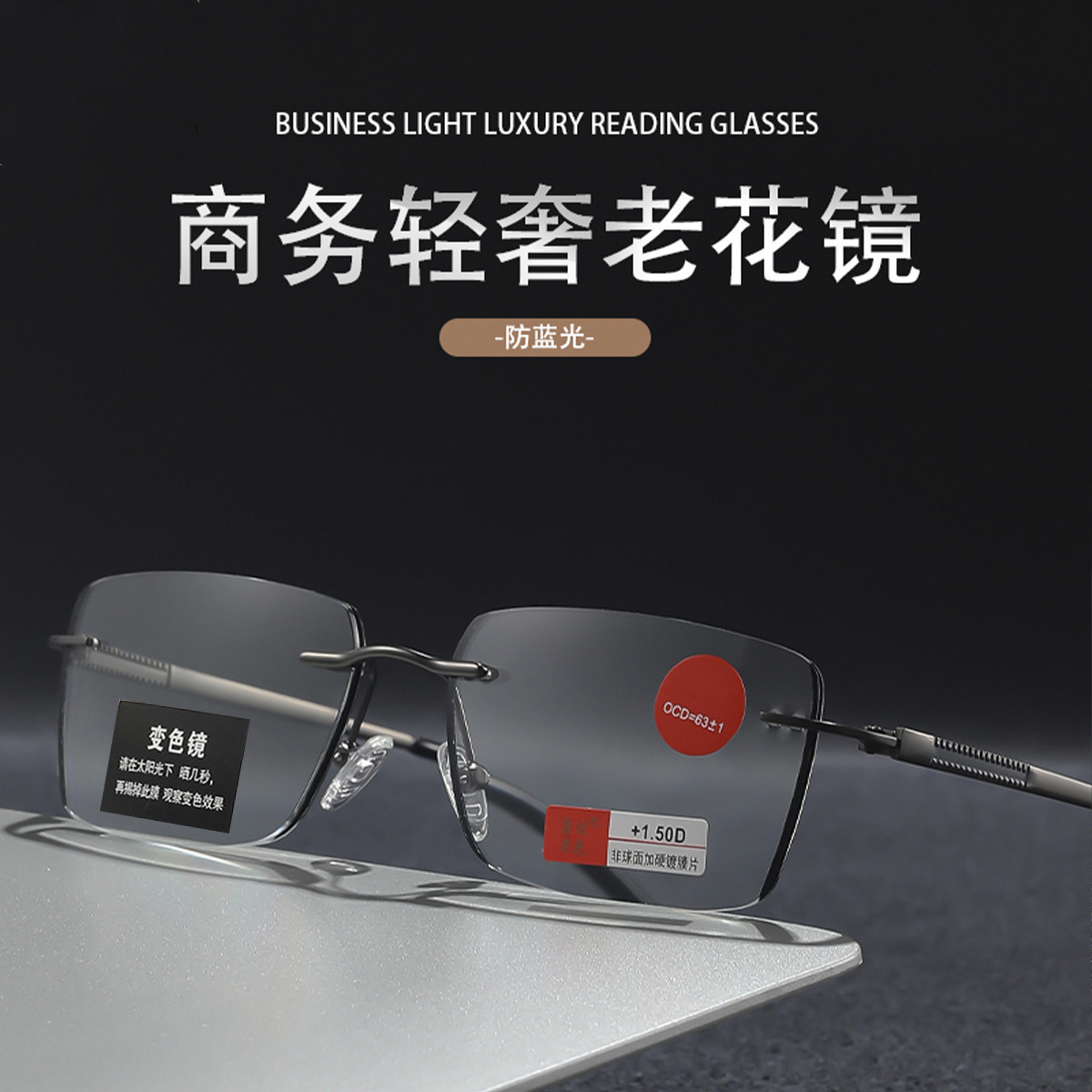 2024款男士智能变色远近两用新款多焦点无框老花镜男女批发金属