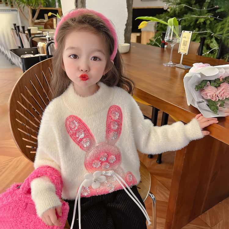 新款宽松洋气上衣女童秋冬针织衫毛衣小兔子亮片针织绣花保暖加厚
