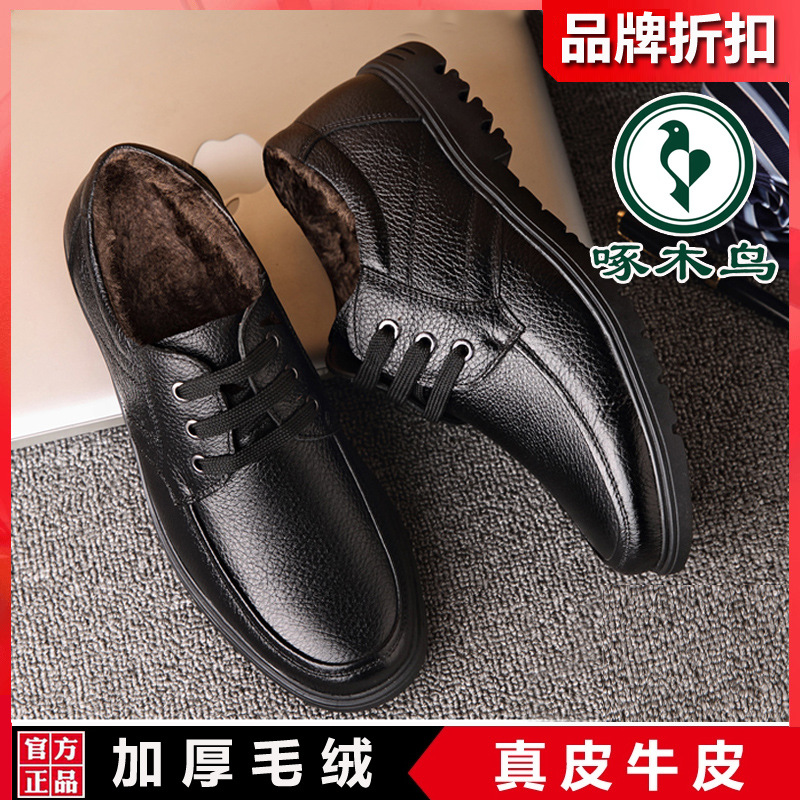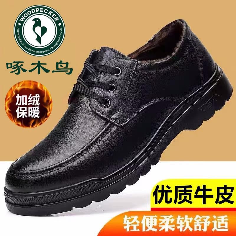 啄木鸟皮鞋男冬季真皮商务休闲透气男鞋中老年软底防滑加绒爸爸鞋