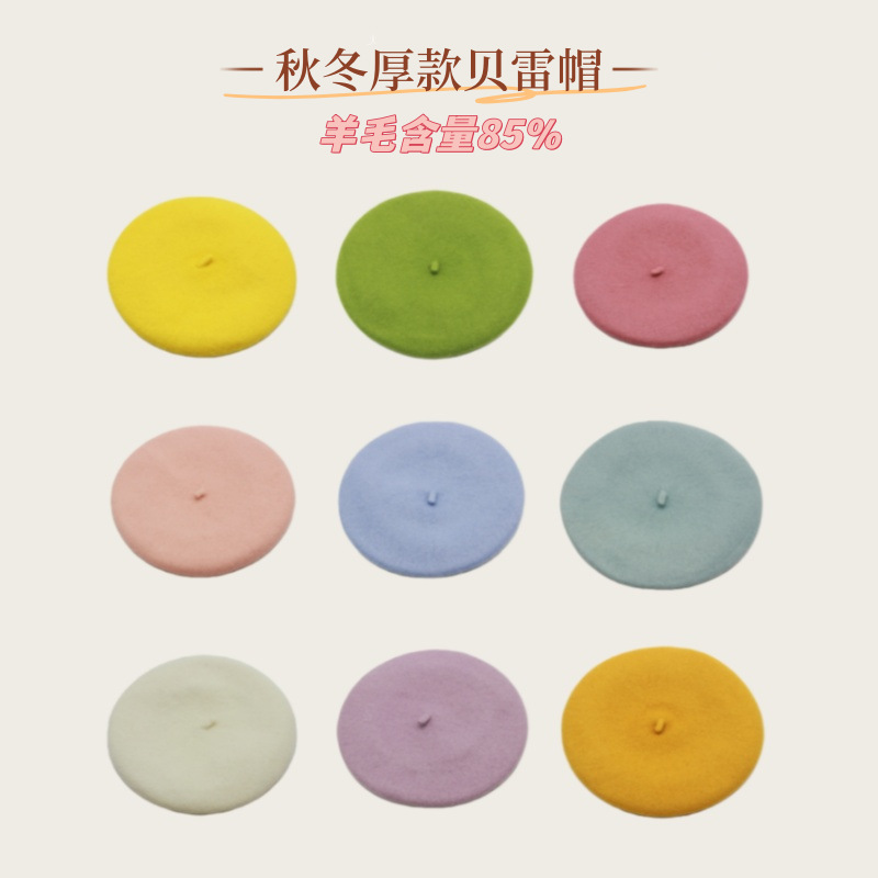 【30色任选】羊毛平板贝雷帽批发女秋冬糖果色毛呢画家帽ins风