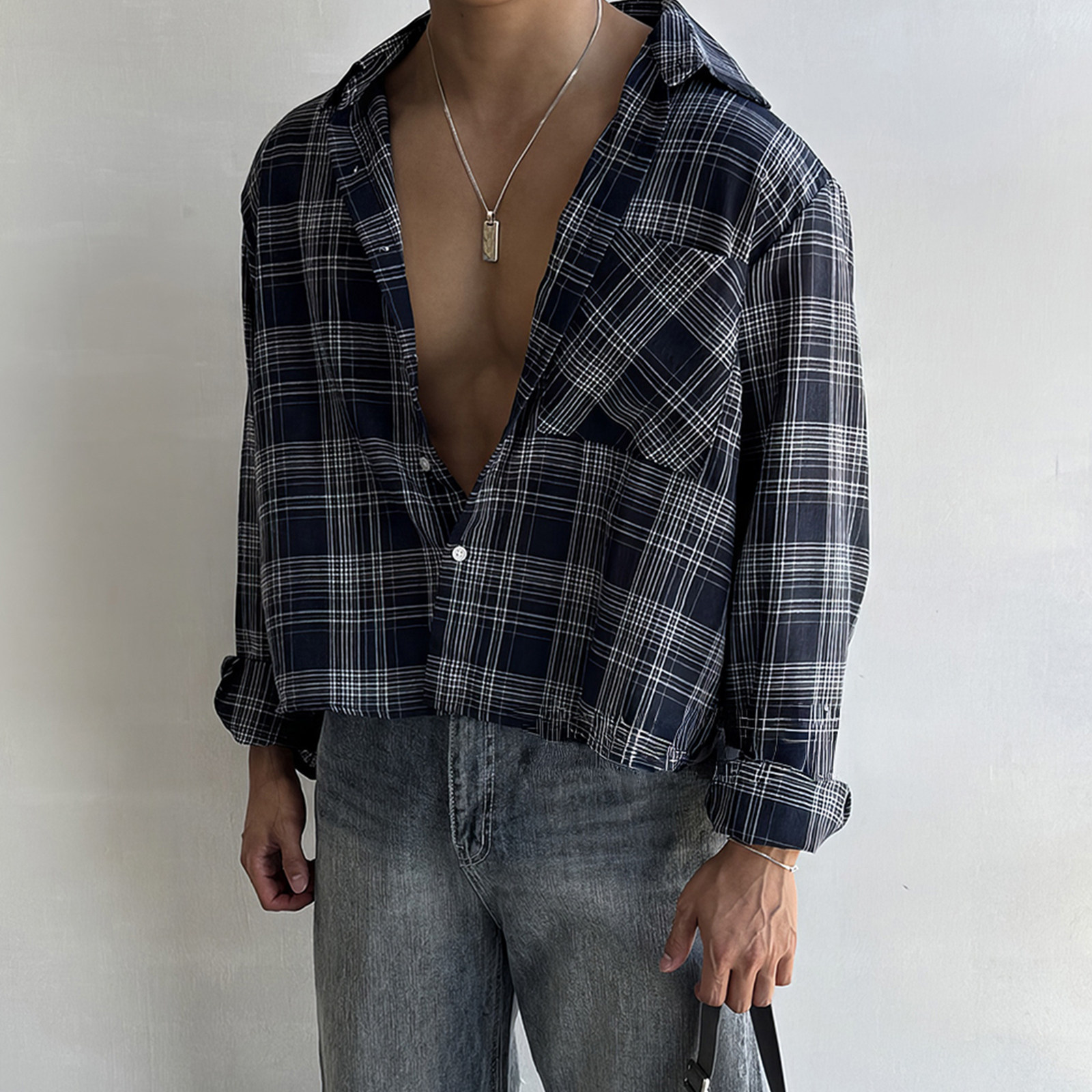 美式短款格子长袖衬衫男春季韩系复古风通勤百搭宽松防晒衬衣外套