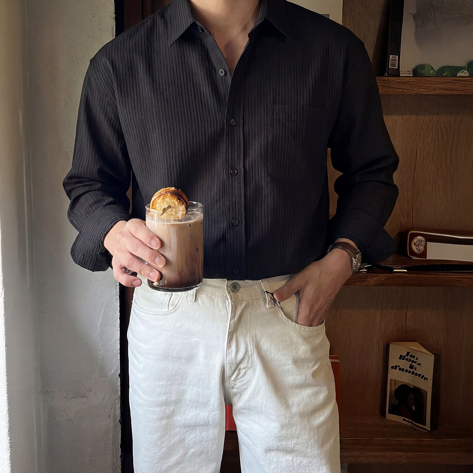 轻熟风黑色肌理感长袖衬衫男翻领免烫高级感垂感休闲商务衬衣外套