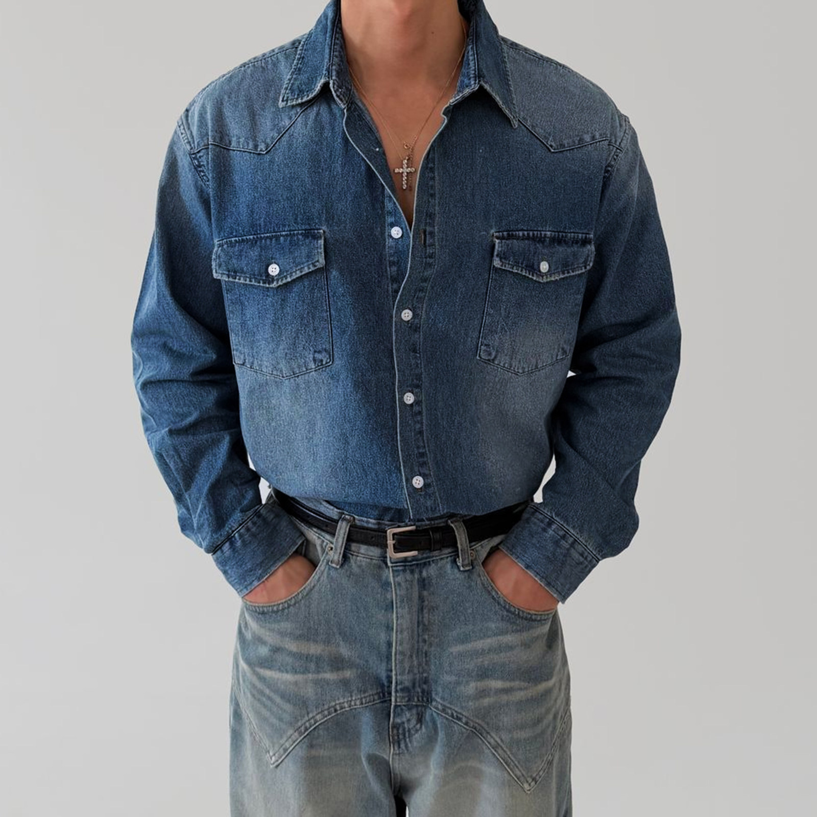 美式复古蓝色水洗做旧牛仔长袖衬衫男春季宽松双口袋工装衬衣外套