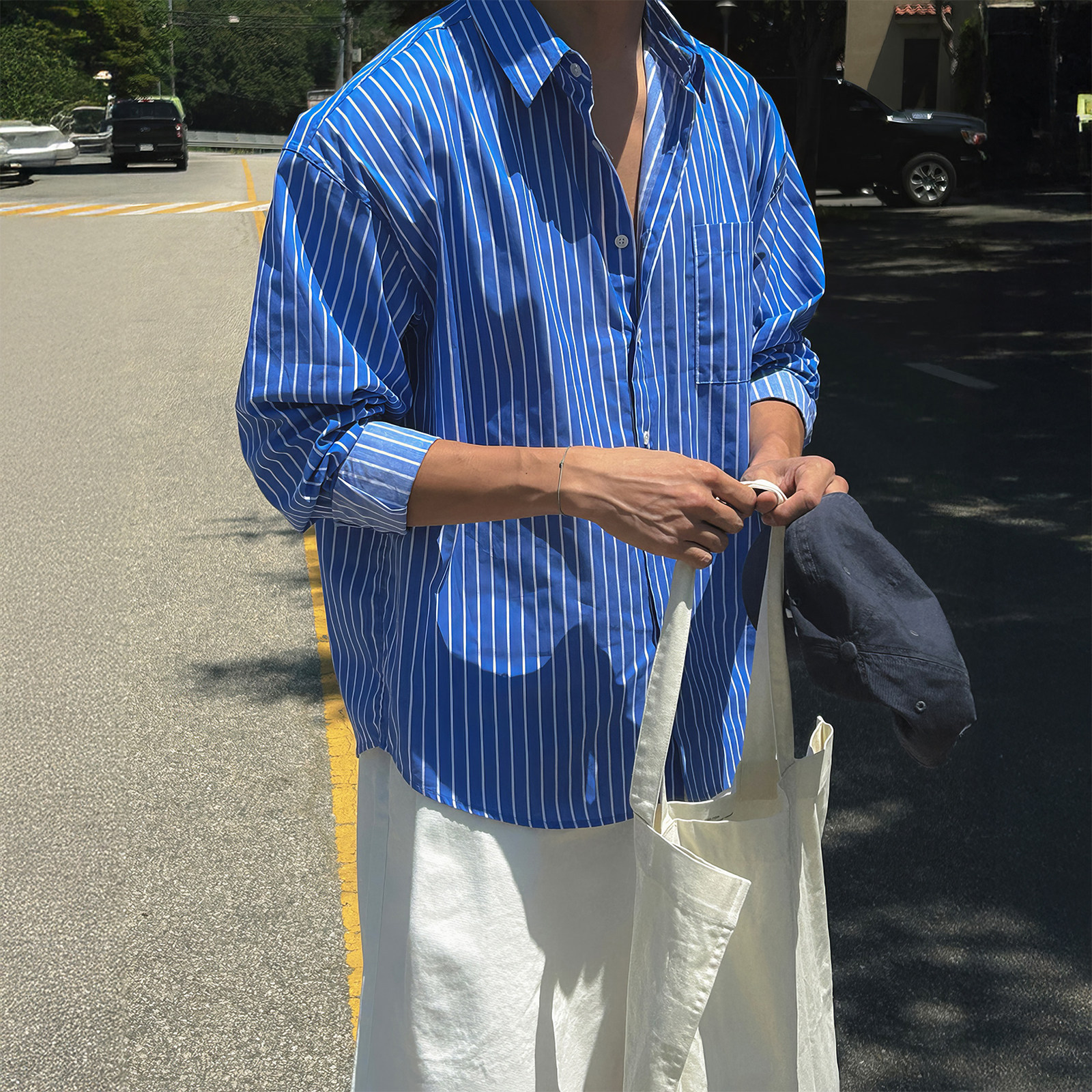蓝色竖条纹长袖衬衫男款春夏韩版高品质翻领衬衣休闲百搭防晒外套