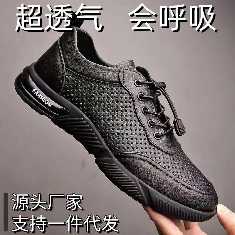 凉鞋男防滑防臭皮面网眼透气休闲软底皮鞋镂空夏季鞋子男百搭潮鞋