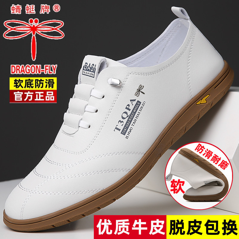 蜻蜓牌男鞋夏季透气真皮软底休闲皮鞋男士时尚小白鞋一脚蹬驾车鞋