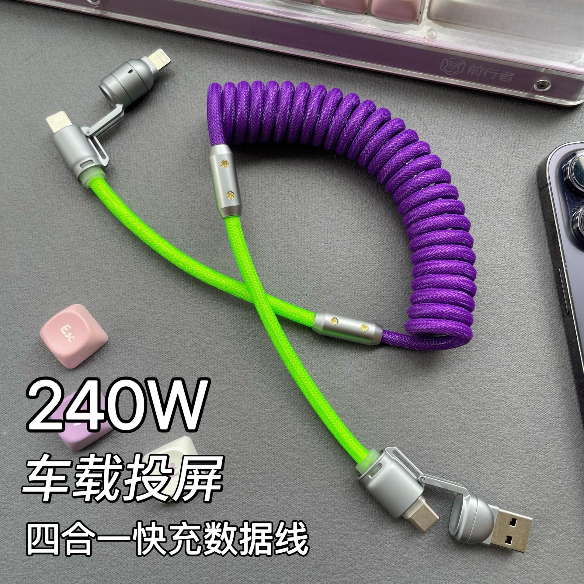 240W弹簧车载快充CarPlay数据线四合一PD超级快充typec伸缩车载充