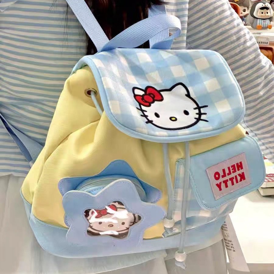 多巴胺Kitty格子抽绳双肩包可爱卡通少女凯蒂猫学院风通勤百搭包