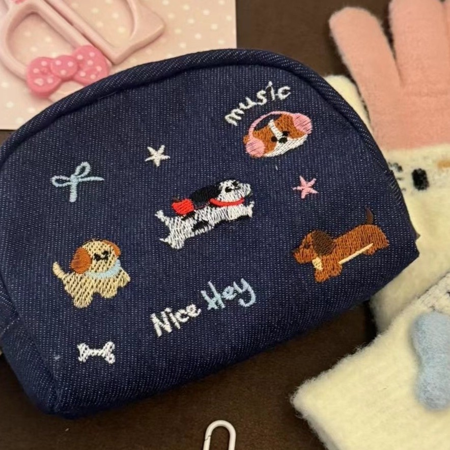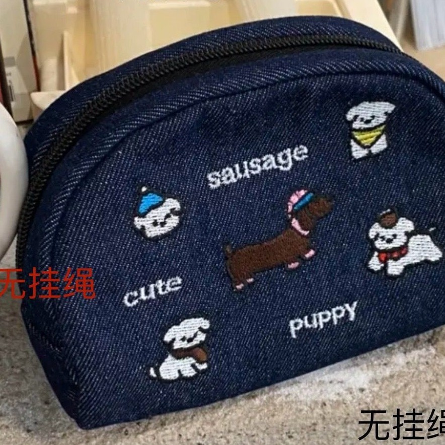 新款牛仔刺绣小狗可爱化妆包多功能收纳包便携通勤零钱包