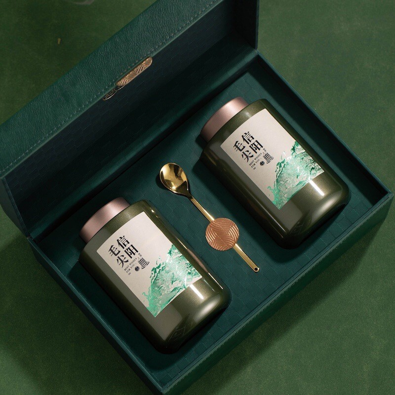 茶叶包装精美皮质礼盒幸会信阳毛尖双圆罐加勺礼盒包装空盒