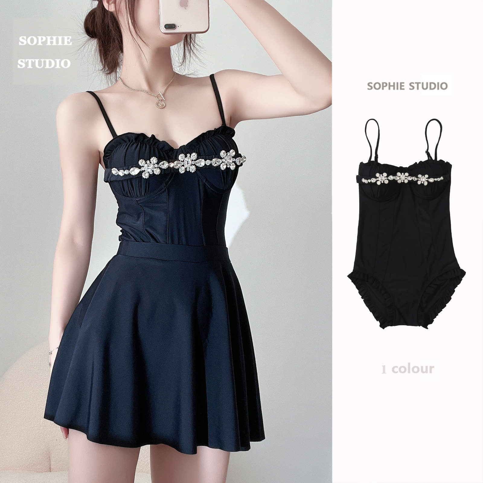 ins法式辣妹修身镶钻抹胸吊带连体泳衣女小胸聚拢法式纯欲风泳装