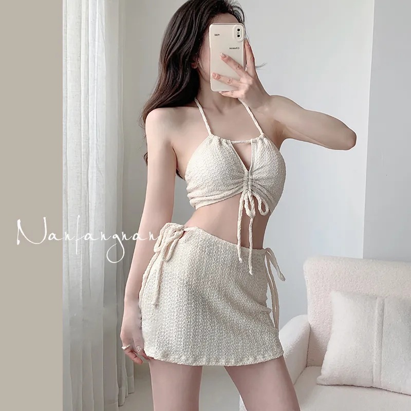 游泳衣女分体式三件套2023新款保守小个子可爱日系小胸泡温泉泳装