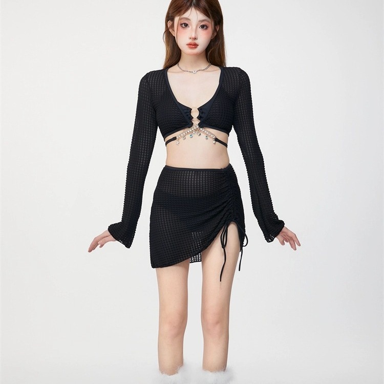 泳衣女款夏新款纯欲风比基尼长袖罩衫包臀裙甜美绑带度假泳装溫泉