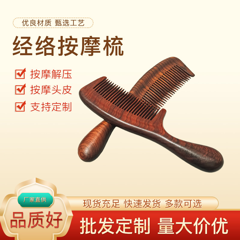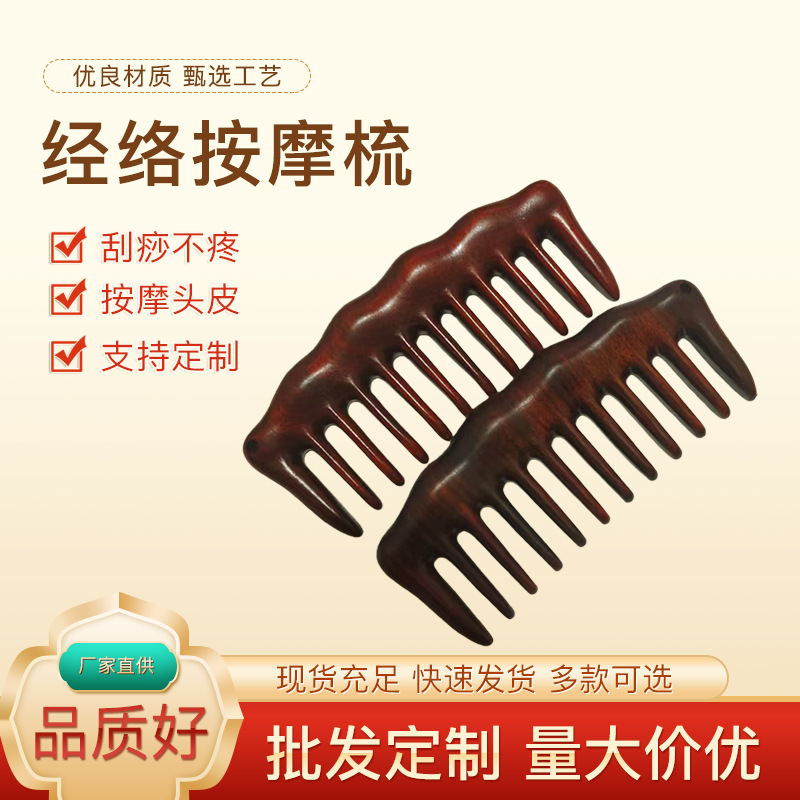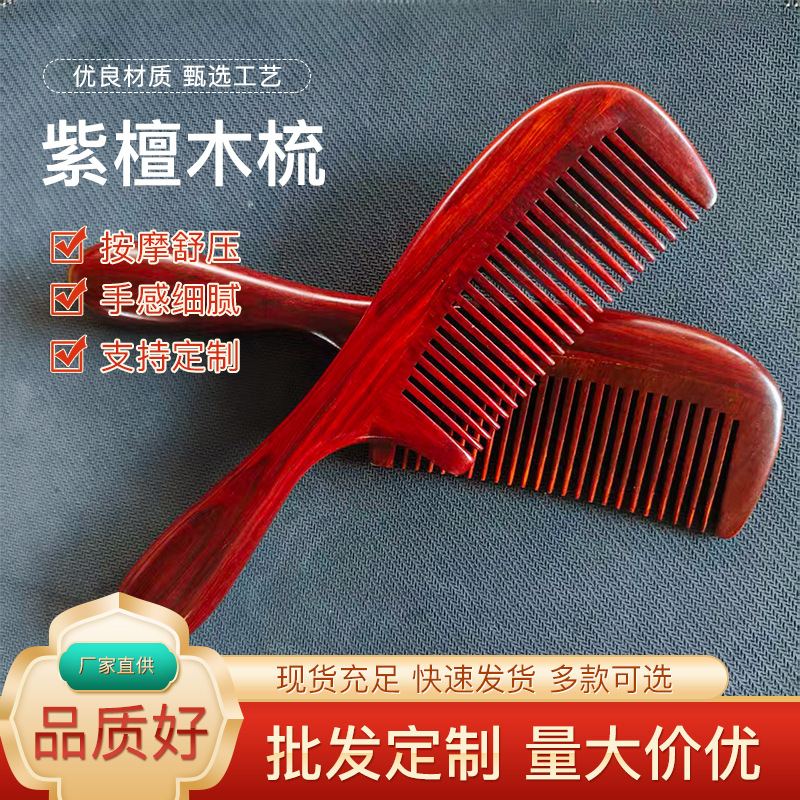 厂家批发缎光紫檀木宽齿梳子大齿按摩家用女士梳紫檀筋络按摩梳