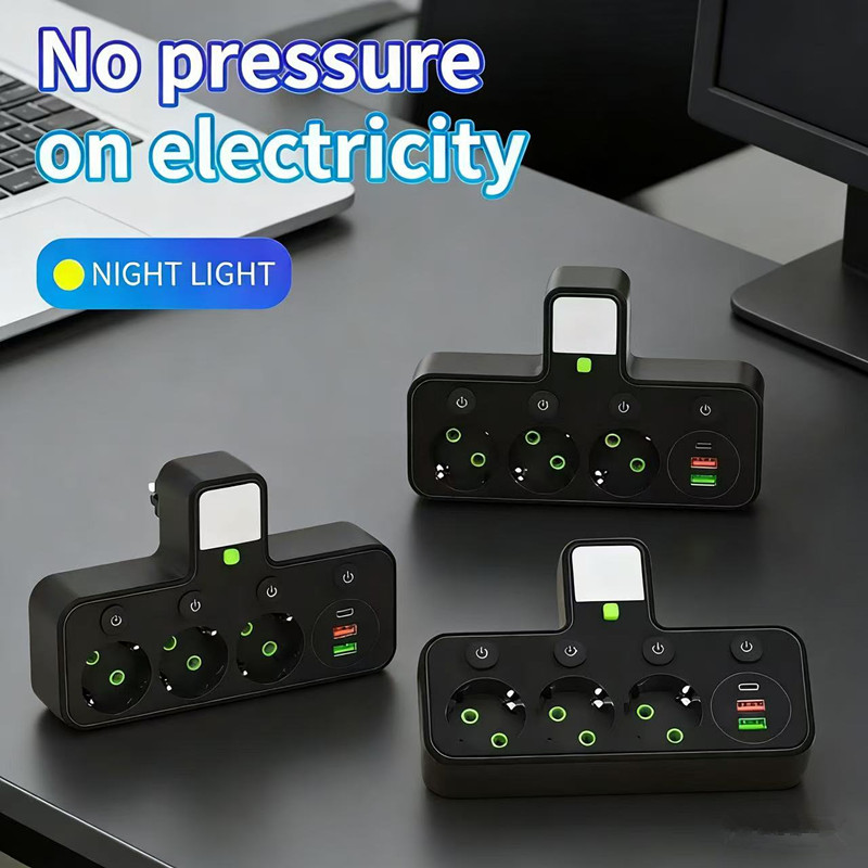 跨境TEMU速卖通欧标一转三转换器插座独立开关USB欧规插排带夜灯