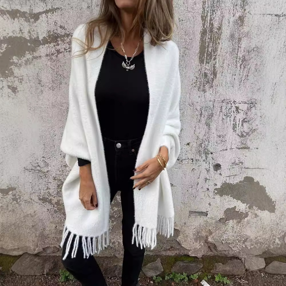 2024秋冬新款跨境外贸女装仿貂绒斗篷流苏披肩纯色加厚保暖蝙蝠