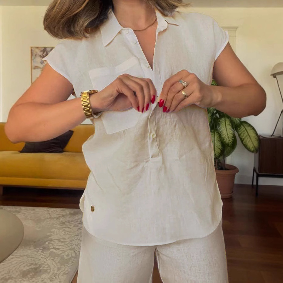 2024跨境外贸独立站夏时尚短袖口袋棉麻半开襟衬衫阔腿裤两件套