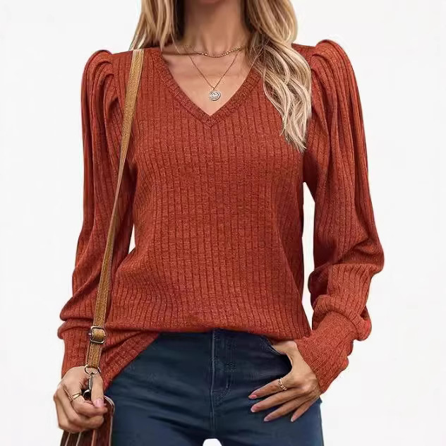 2024亚马逊跨境独立站女式坑条上衣v领针织长袖