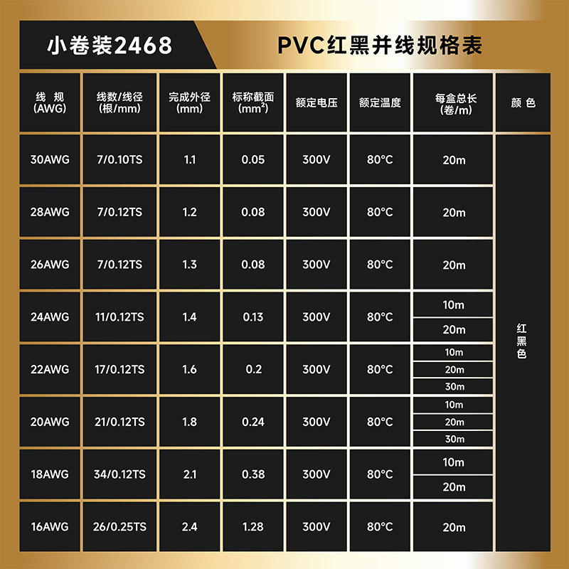 产品规格 | 30AWG-16AWG | | 产品型号 | 小卷装2468PVC双并线红黑 |