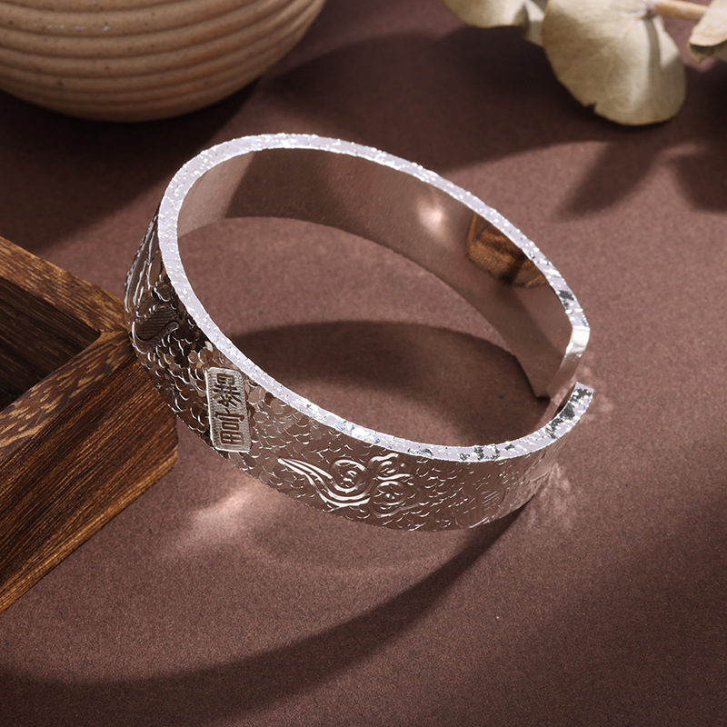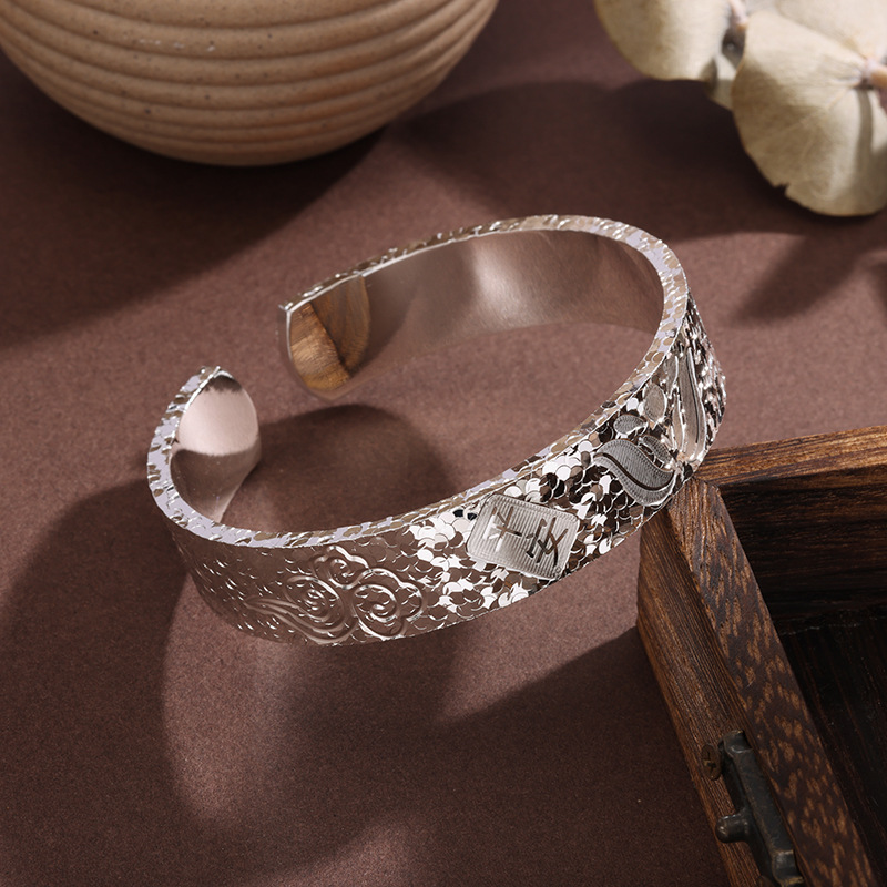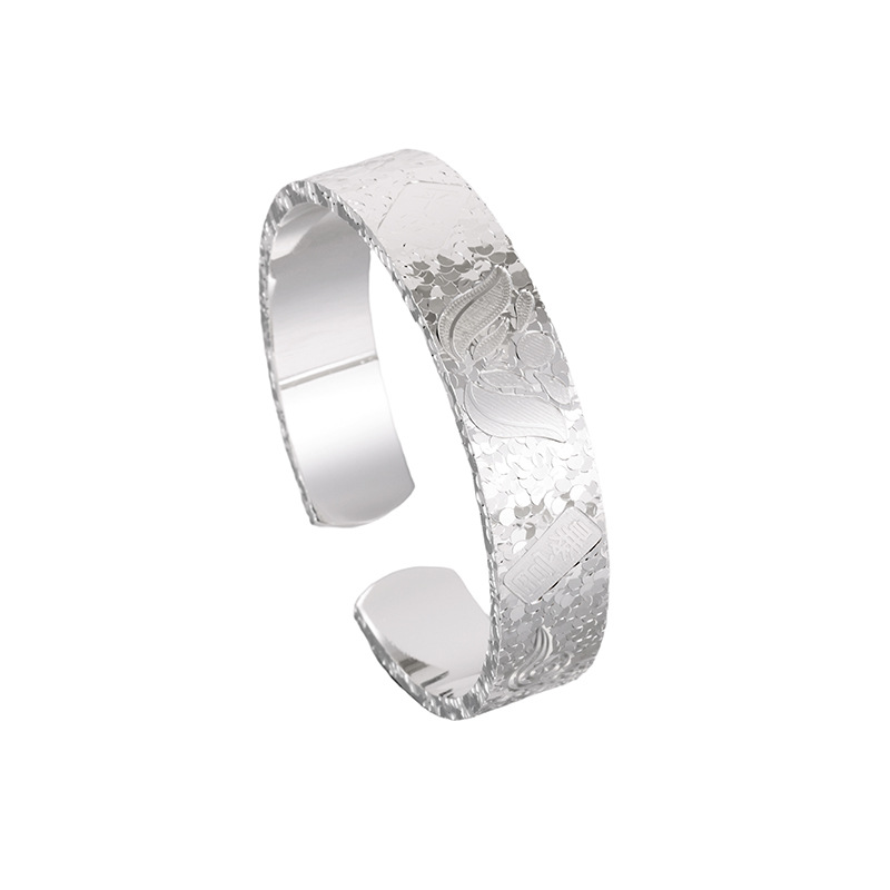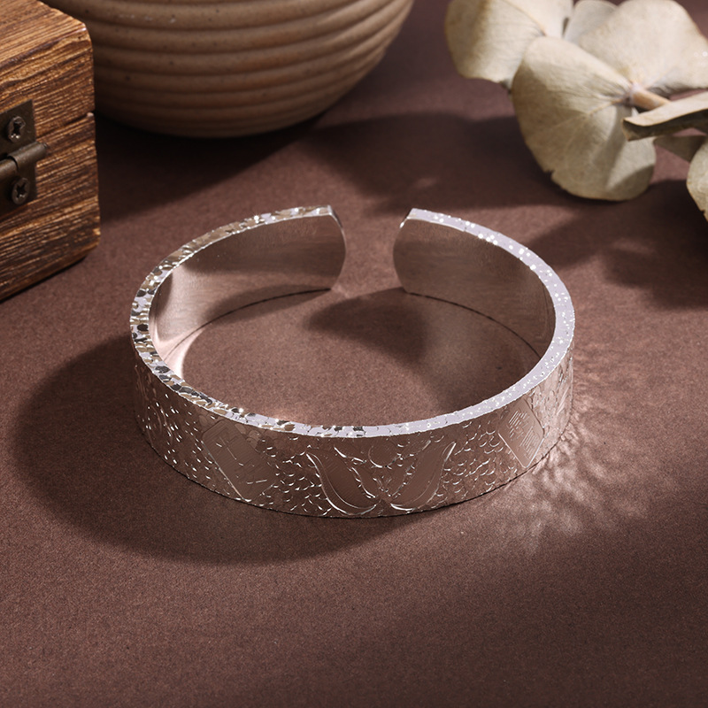 白铜镀银手镯宽版吉言碎冰冰手镯实心开口錾刻荷花平安爆闪手环