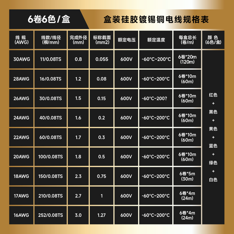 | 规格型号 | 6卷/盒装硅胶线-17AWG-6卷*4米-红黑黄蓝绿白 | 规格型号 | 6卷/盒装硅胶线-16AWG-6卷*4米-红黑黄蓝绿白 |