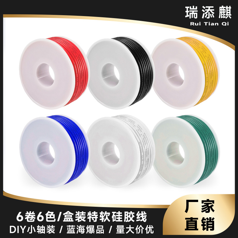 | 产品型号 | 6卷/盒装硅胶电线 | 规格型号 | 6卷/盒装硅胶线-30AWG-6卷*20米-红黑黄蓝绿白 |