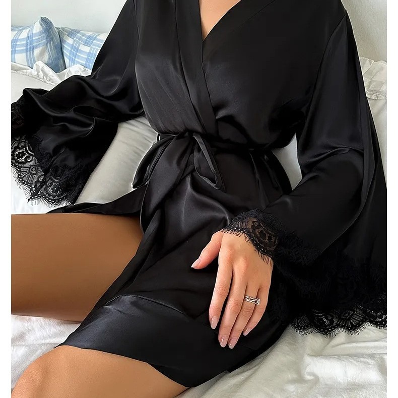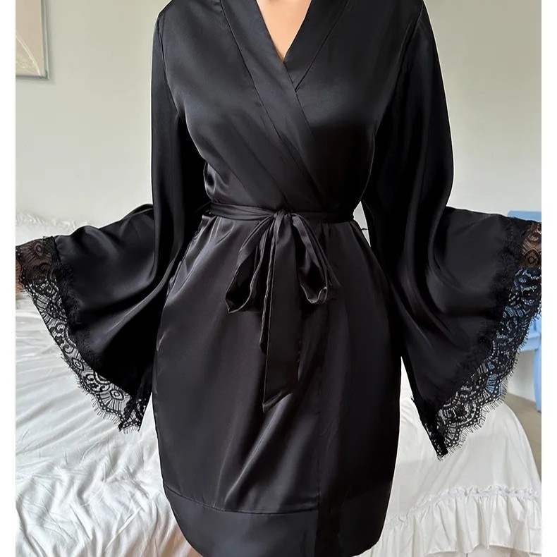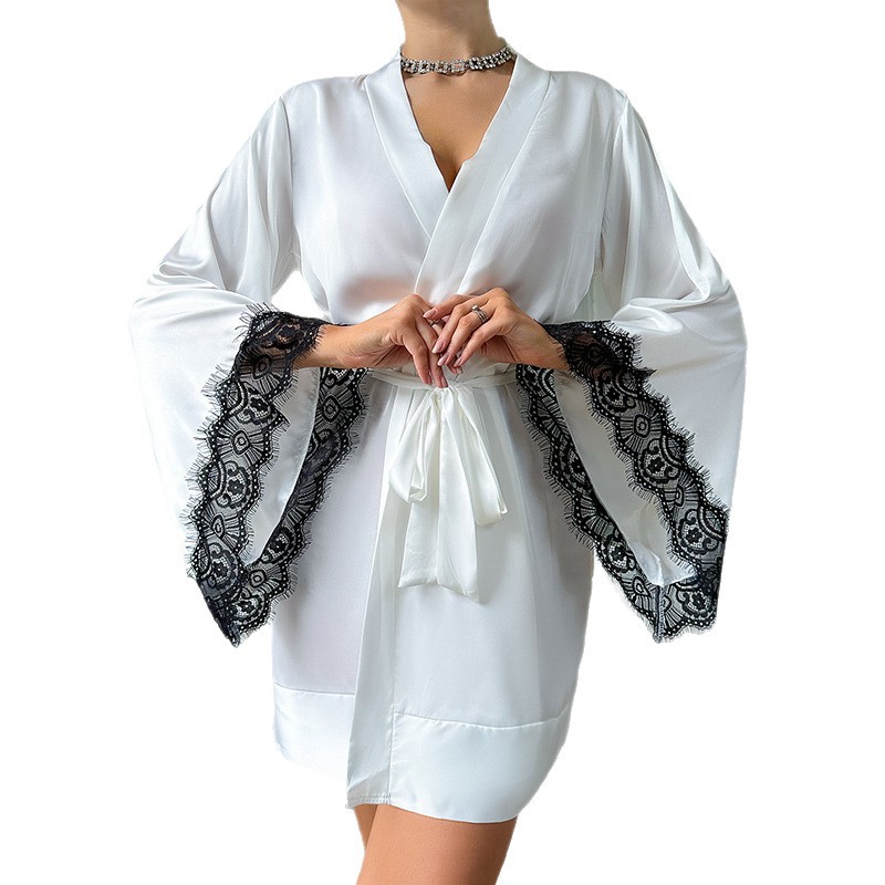 欧美跨境性感诱惑睡衣女夏冰丝情趣内衣睡袍浴袍长袖蕾丝家居服
