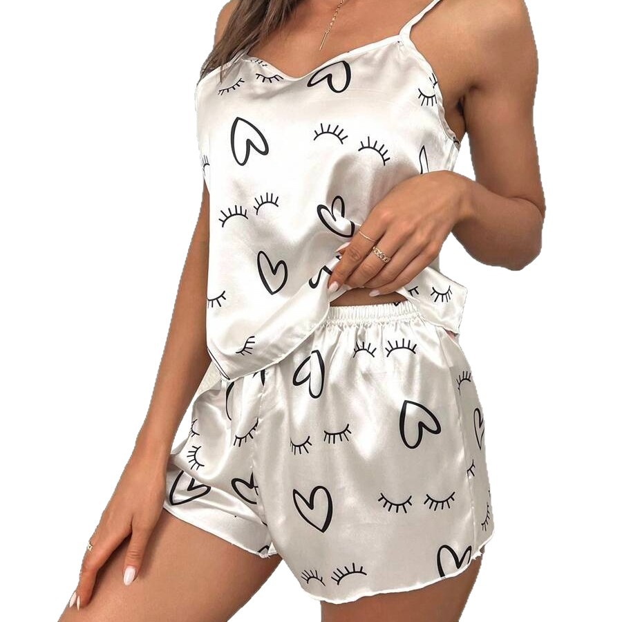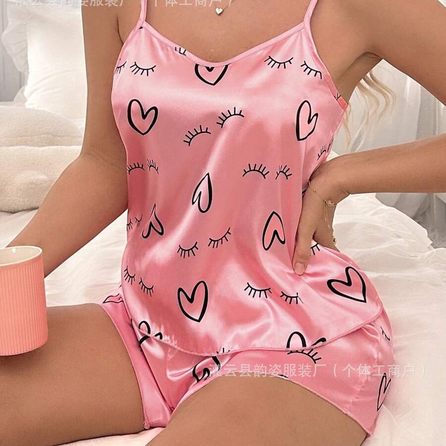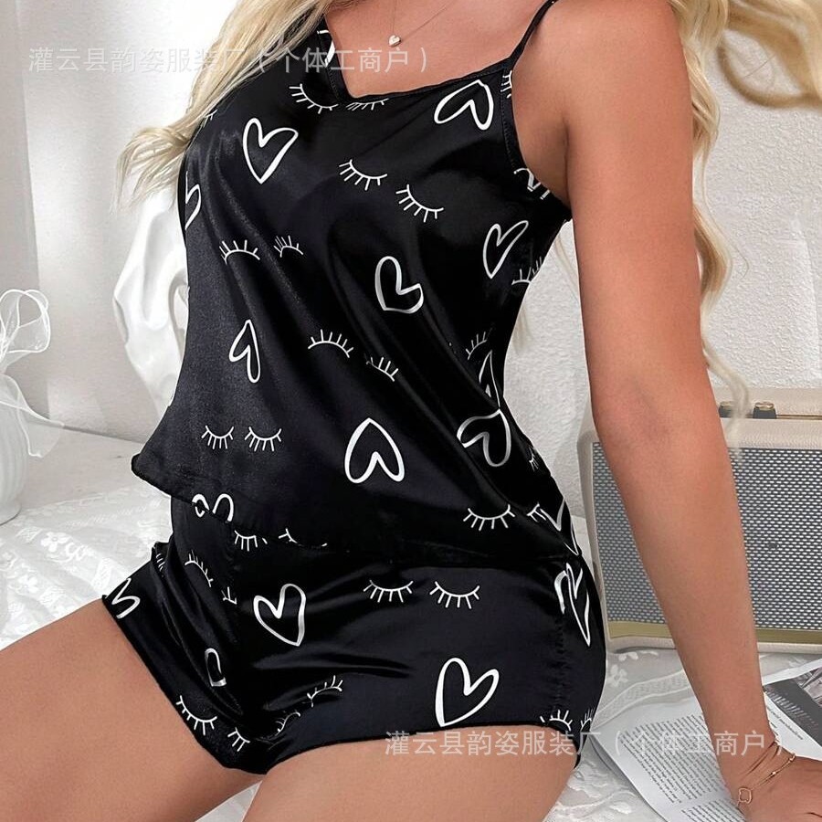 欧美2025新款爱心印花睡衣女夏情趣内衣性感吊带短裤居家服套装