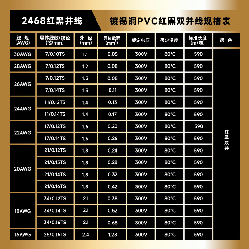 产品型号 | 2468红黑并线 | | 产品规格 | 16AWG-30AWG |