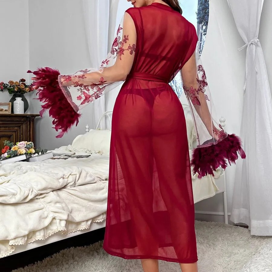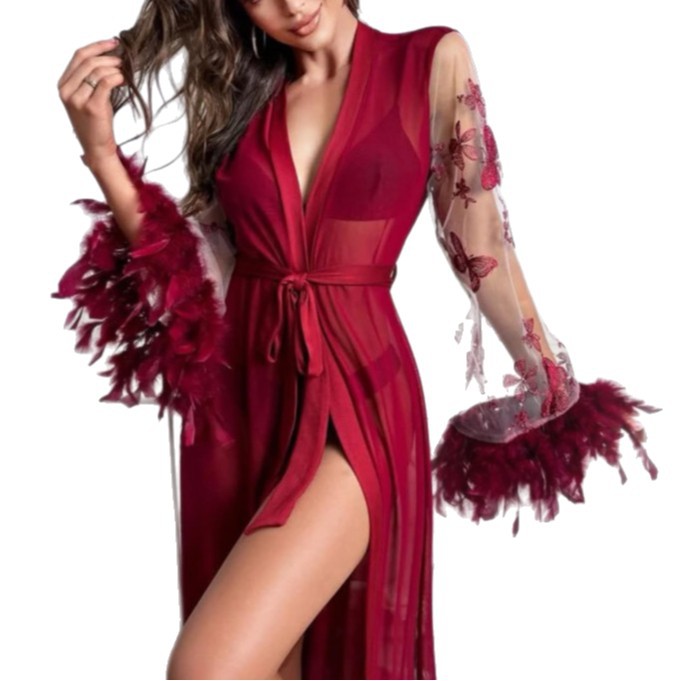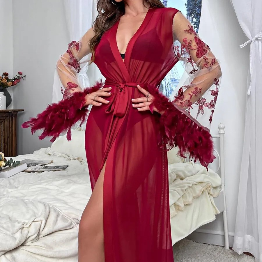新款法式睡袍女夏蕾丝带羽毛家居服性感内衣开衫薄款情趣浴袍睡衣